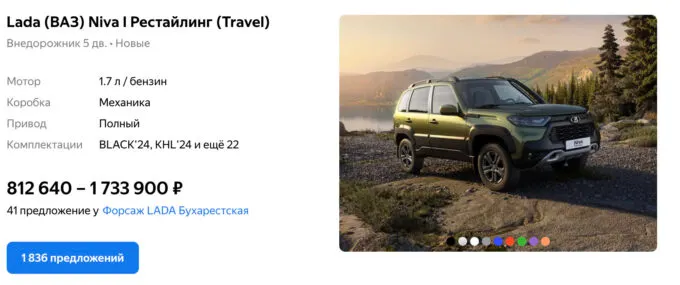 За люксовую версию полноприводный модели, которая радикально не меняется уже несколько десятков лет, дилер просит 1,6 млн рублей. При этом рекомендованная розничная цена от АвтоВАЗа составляет 1,21 млн рублей.