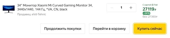 Сейчас Xiaomi Curved Display можно урвать на Яндекс Маркете за 27 393 рубля и кэшбекнуть под 3 косаря при оплате картами некоторых банков. Так он обойдётся дешевле 25 тысяч рублей.