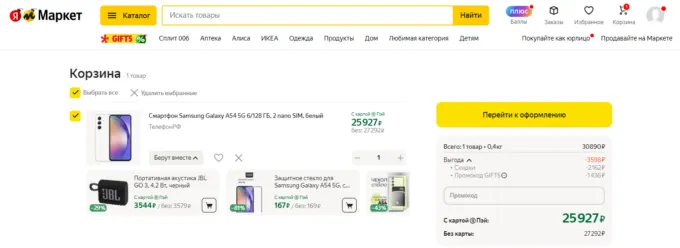 Хотите забрать хитяру со скидкой? Переходите по ссылке на Яндекс.Маркет, добавляйте смарт в корзину и вбивайте промокод GIFT5 — цена на Samsung Galaxy A54 опустится до 27 292 рублей. Стоит отметить, что прайс может варьироваться в зависимости от региона — нужно переключиться на столицу и проверить можно ли оформить доставку.