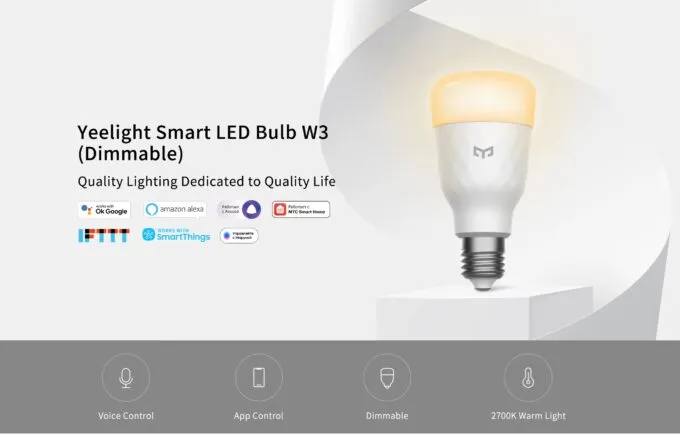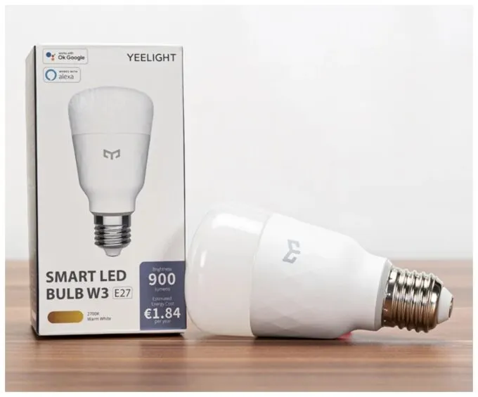 Yeelight Smart LED Bulb W3 — умная лампа со стандартным набором функций от проверенного бренда Xiaomi. При правильном использовании она прослужит не один год, что уже хорошо для лампочки в целом. Девайс предлагает регулировку яркости и удалённое включение/выключение. Температурный диапазон встроенных светодиодов — от 2700К до 3000К. Этот показатель максимально близок к тёплому белому оттенку.