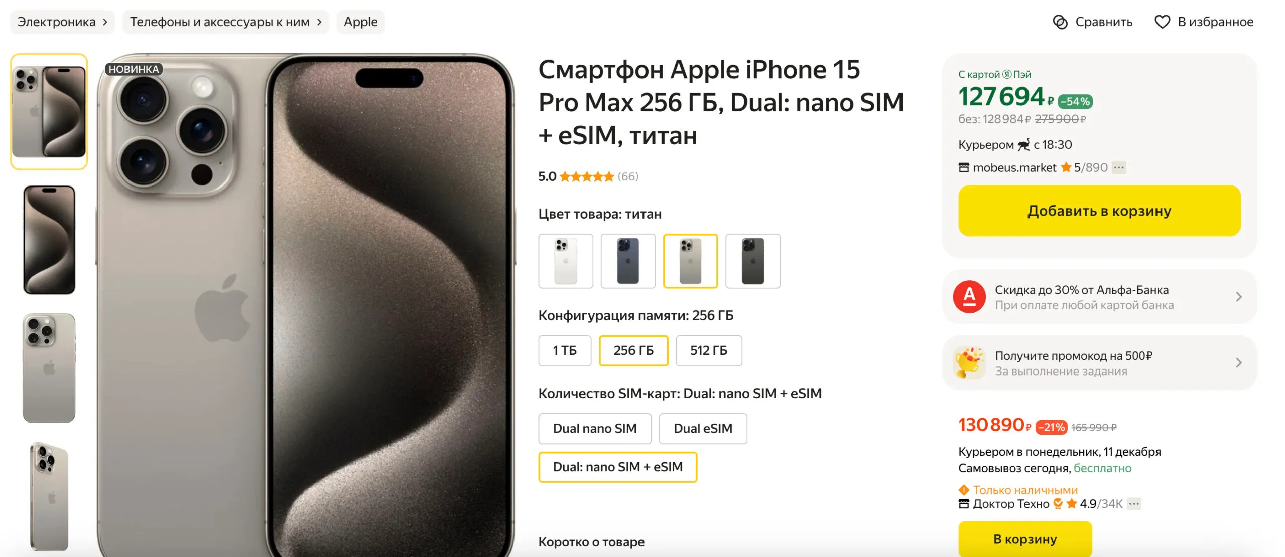 iPhone 15 Pro Max можно взять за 127 694 рубля — такой прайс показывает Маркет по состоянию на 8 декабря. Напомним, что еще в ноябре девайс стоил около 150 тысяч рублей, а на старте продаж за стартовую модель просили 200К и больше.