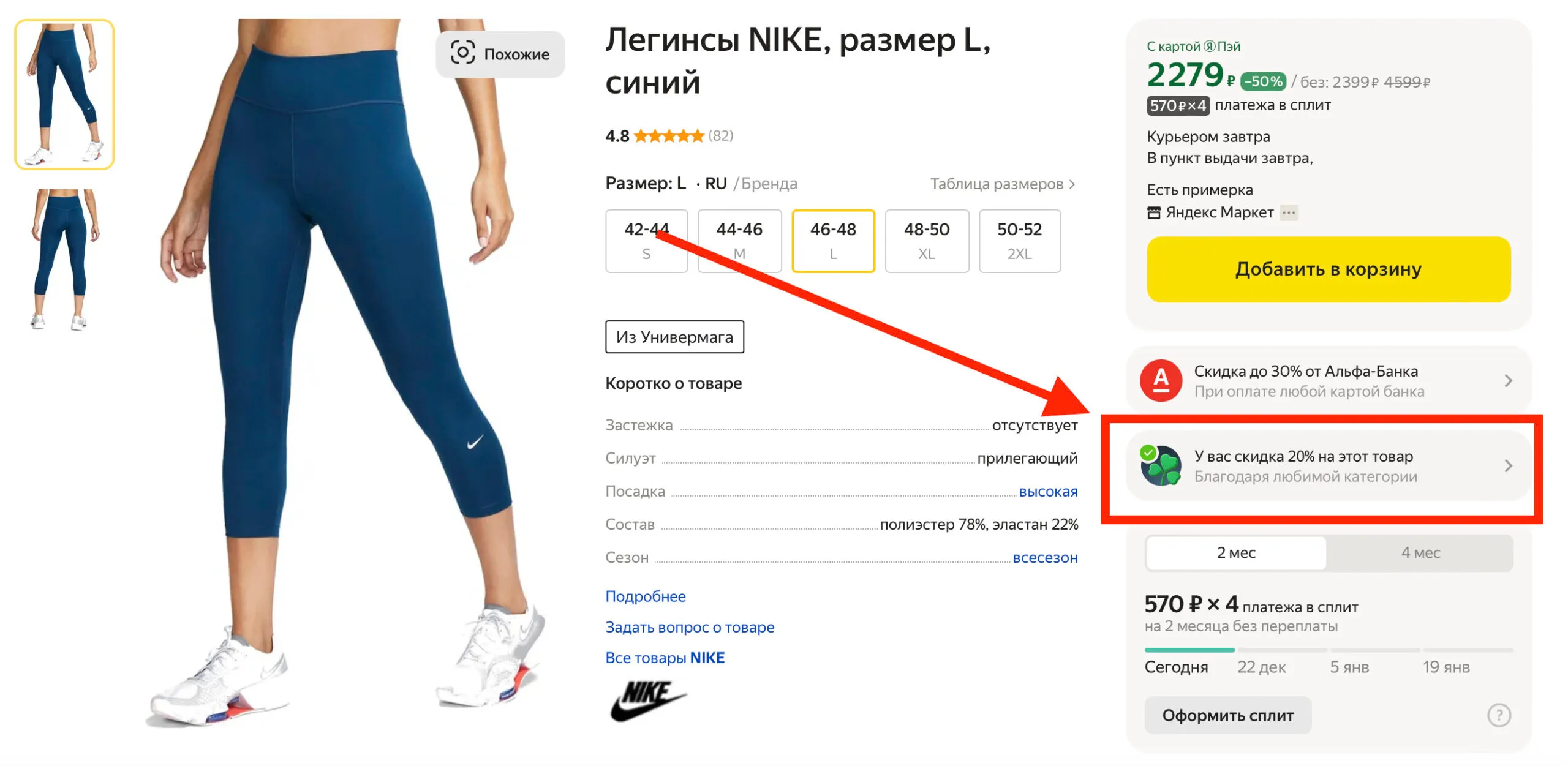 Например, мы выбрали скидку 20% на бренд Nike и открыли рандомный товар из этой категории. В описании лота указано, что вещь доступна со скидкой, так как у нас выбрана любимая категория.