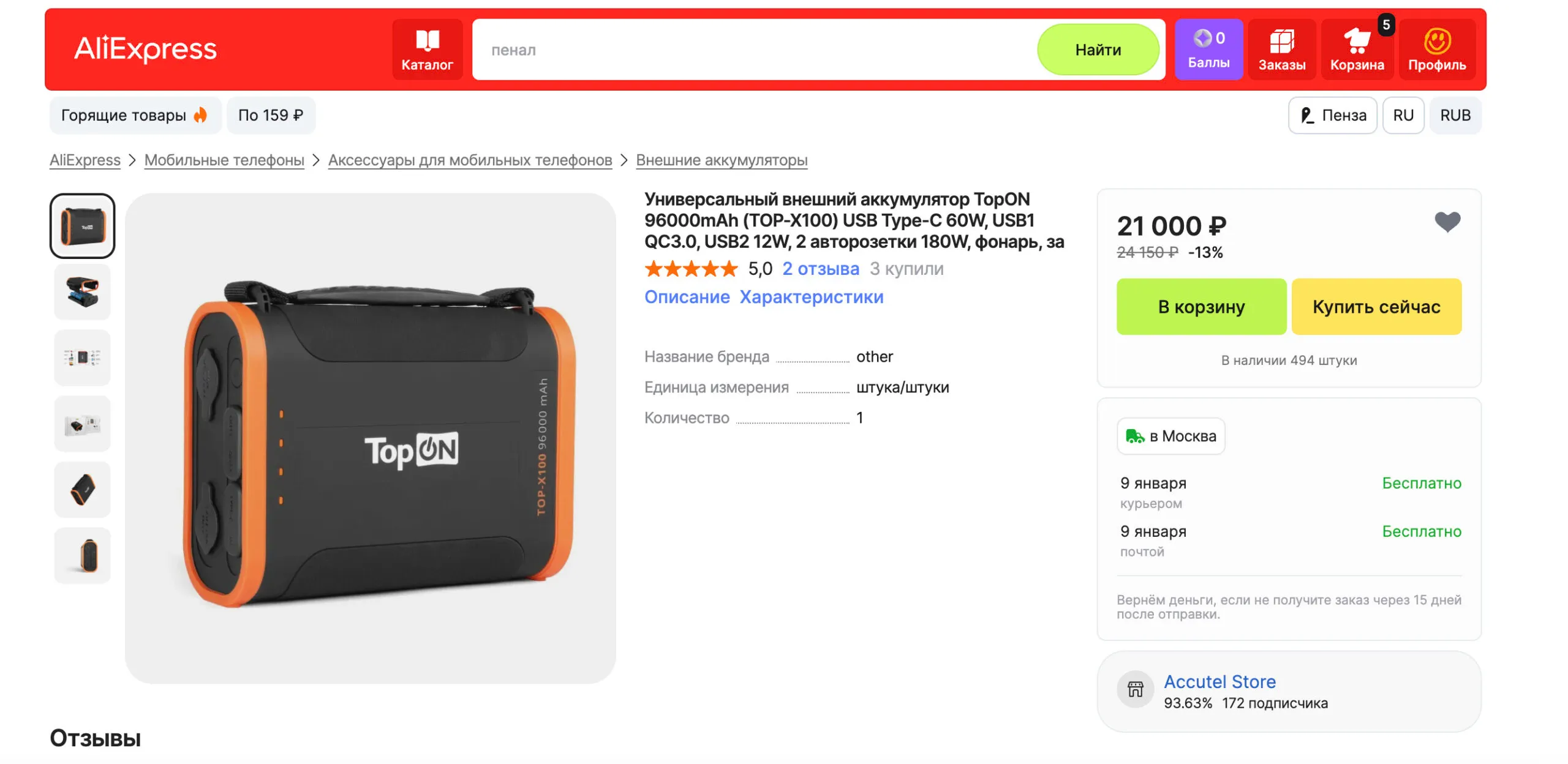 Здесь мощный пауэрбанк отдают за 21 000 рублей. На всякий случай добавим дублирующие ссылки, потому что внешние батареи быстро разбирают — раз, два и три.