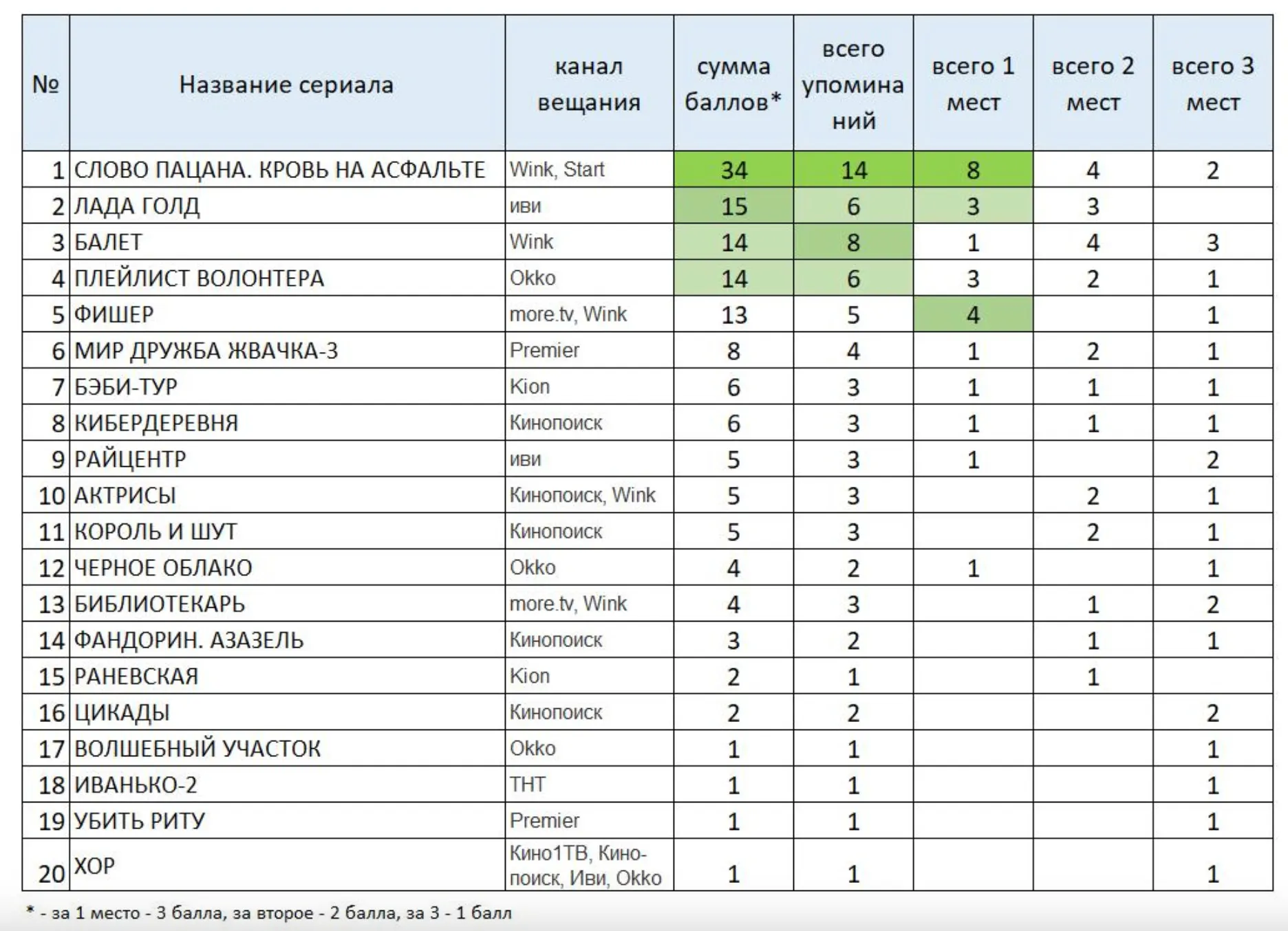 Лидером рейтинга ожидаемо стал сериал «Слово пацана. Кровь на асфальте», который вызвал бурную дискуссию в медиа. Вышедший на платформах Wink и Start релиз получил 34 балла, 14 упоминаний и 8 первых мест. На второй позиции разместили эксклюзив IVI «Лада Голд» — бодрый восьмисерийный фильм, рассказывающий о внуках криминального авторитета и принципиального мента, а также о тачке из чистого золота.