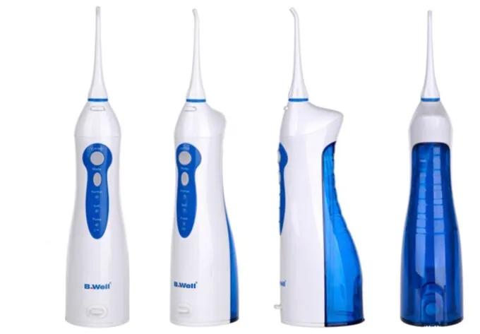 Относительно дешевый, но имеет большое количество насадок в комплекте. Есть четыре режима работы, аппарат может создавать до 1600 микроимпульсов в минуту. Насадки вращаются на 360 градусов, через две минуты девайс автоматически выключается — защита от перегрева. Резервуар имеет емкость 300 мл, четырехчасовой зарядки хватает на 30 дней использования.