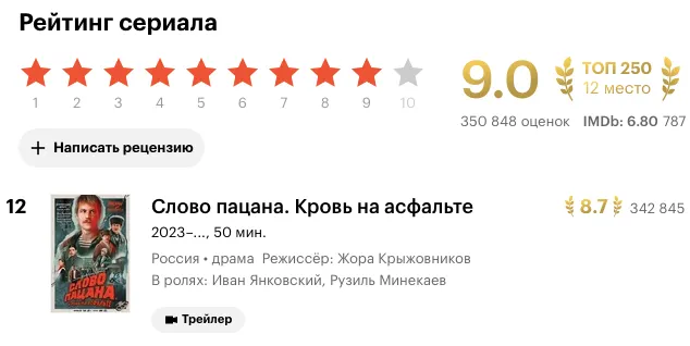 Тем не менее, Крыжовников все равно должен быть рад. Сейчас «Слово пацана. Кровь на асфальте» занимает 12 место в топе лучших сериалов Кинопоиска и обгоняет «Шерлока», «Клинику» и «Теда Лассо». А это выдающееся достижение.