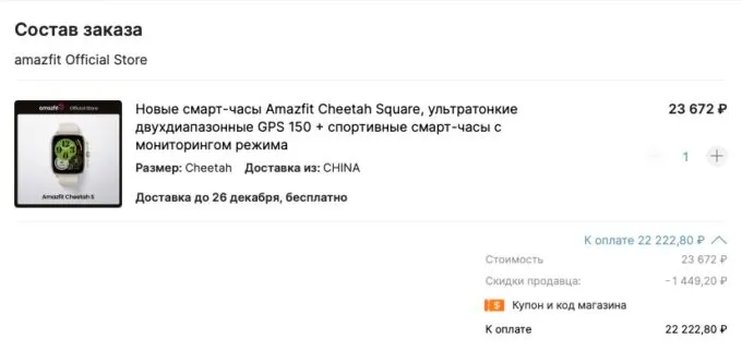 Сейчас на AliExpress флагманские Amazfit Cheetah Square сливают всего за 22 222 рубля с учётом купонов продавца.