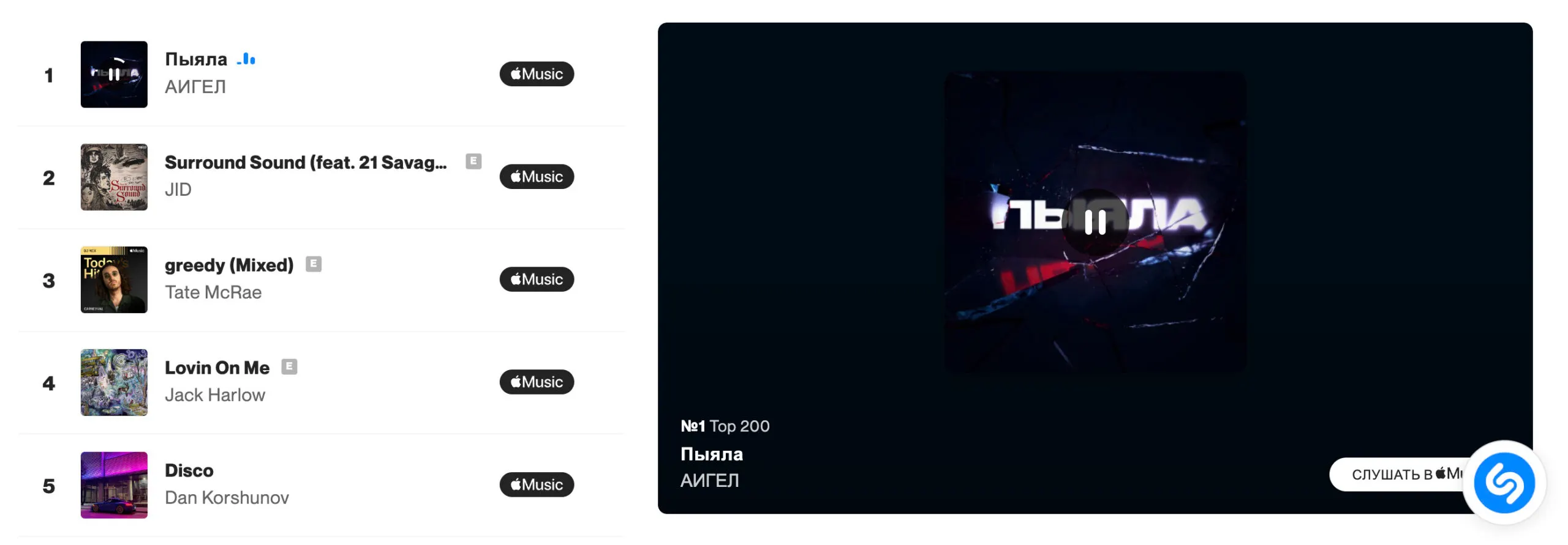 В начале декабря трек АИГЕЛ «Пыяла» возглавил мировой топ Shazam — композицию искал почти миллион пользователей. При этом песня исполняется на татарском языке, очевидно ее смысл непонятен подавляющему большинству слушателей.