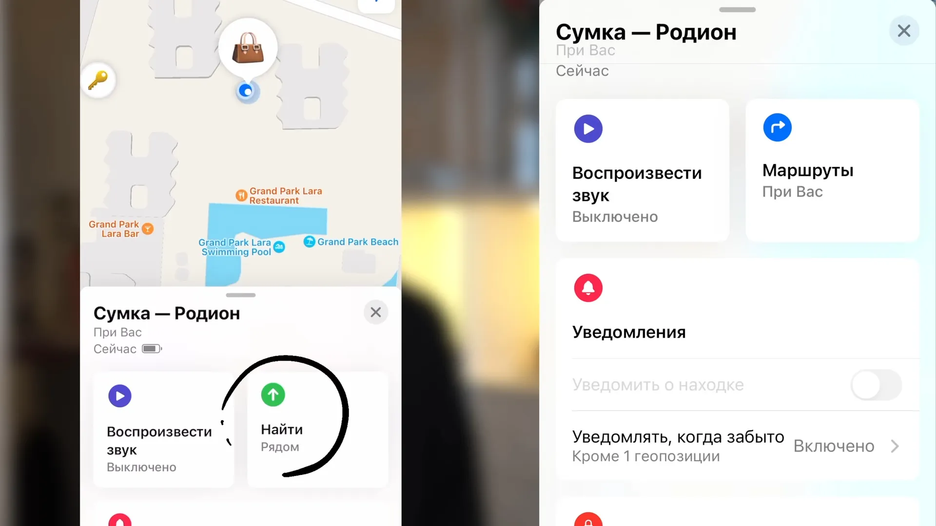 Например, вот блогер поехал в Турцию и обнаружил в приложении «Локатор» напротив своего AirTag (там тоже есть U1) кнопку «Найти рядом»: