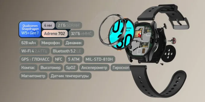 TicWatch Pro 5 получили процессор Snapdragon W5+Gen 1, 2 Гбайт ОЗУ, 32 Гбайт встроенной памяти. Часы работают вполне быстро, лагов практически нет. Есть пульсометр, пульсоксиметр, гироскоп, датчик температуры, магнитометр.