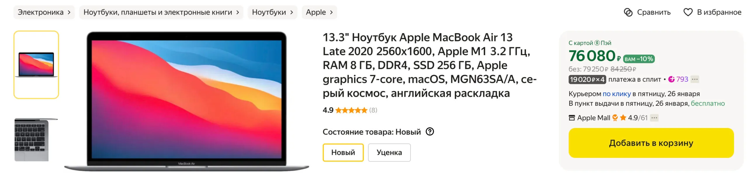 Коротко: MacBook Air M1 можно купить за рекордные 76 тысяч рублей
