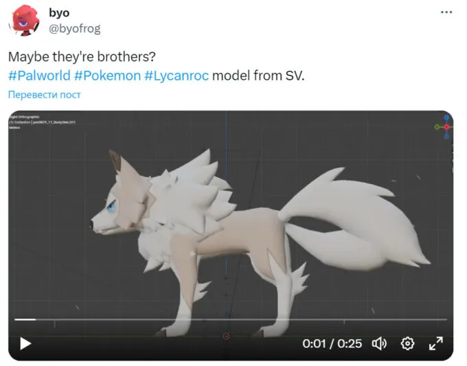 Некоторые пользователи пытаются доказать эту теорию с помощью прямого сравнения. Один из них наложил друг на друга 3D-модельки покемона Ликанрока из Pokemon Scarlet & Violet 2022 года и пала Дайрхаула из Palworld. Совпадение практически полное.