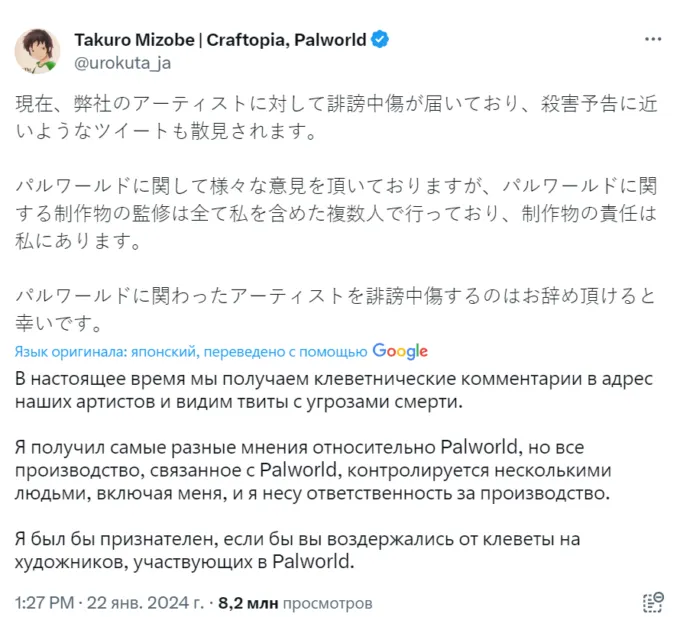 В итоге глава Pocket Pair Такуро Мизобе сообщил, что его беспокоит, что художники Palworld начали получать угрозы расправы от некоторых пользователей. Он заявил, что всю ответственность за производство игры несет лично он, а от художников всем следует отстать. Но фон, конечно, очень напряженный.