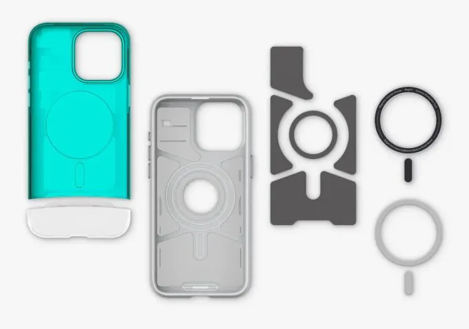 Сам чехол Spigen C1 MagFit состоит из нескольких слоёв. Всё, что вы видите — не дешевый принт, как на большинстве других кейсов. Наш лот состоит из подложки со схематичным расположением компонентов iPhone, кольца MagSafe, полупрозрачной накладки и белой заглушки снизу. Такое двухцветное сочетание придаёт чехлу большей выразительности.