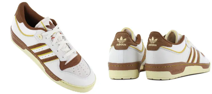 Второй лот – бело-коричневые adidas Originals Rivalry 86 Low. Это классическая модель с резиновой подошвой Grippy и EVA-межподошвой, отвечающей за амортизацию во время ходьбы. Дизайн отсылает к ретро-кроссовкам из 1980-х, а язычок украшен логотипом adidas Originals.