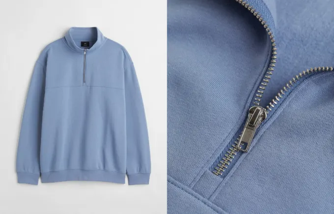 Начинаем с синего свитшота. От базовых моделей этот айтем отличается молнией и воротником-стойкой. Внутри расположилась мягкая подкладка, которая делает эту толстовку идеальным вариантом на зиму-весну.