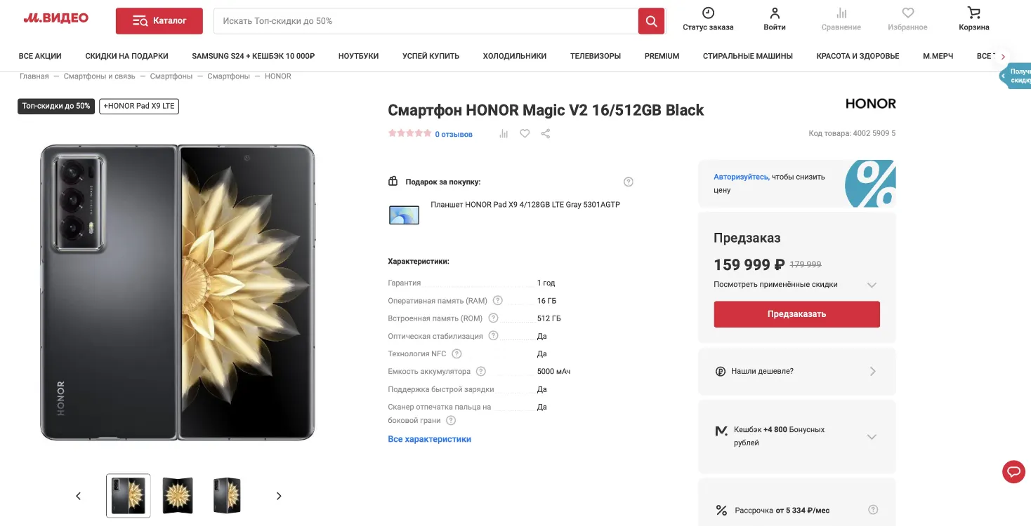 У официальных ритейлеров Magic V2 стоит 159 999 рублей — в ценник входит скидка 20К, также магазины дарят за покупку планшет Honor Pad X9 LTE. Например, складной гаджет доступен в «М.Видео» — ссылки на другие магазины легко найдете сами.