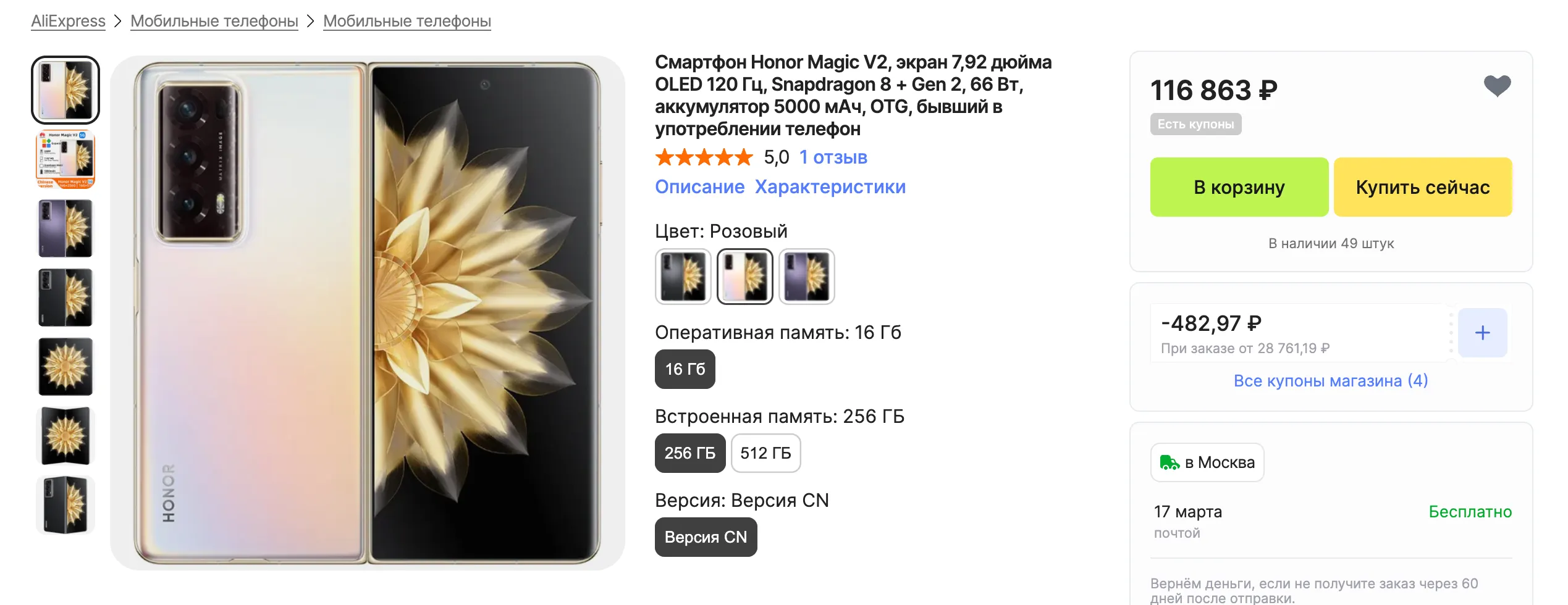 Еще Honor Magic V2 отдают на Али, где модель сливают с большим дисконтом — за 117 тысяч рублей. Но не забываем про пошлину.