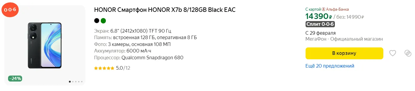 С учетом цены эти минусы простительны — они свойственны и ценовым альтернативам. Зато таких преимуществ у конкурентов просто нет, поэтому смело хватайте Honor X7b, пока он не подорожал. Прямо сейчас смартфон обойдется в 14 390 рублей, если оплатите любой картой «Альфы». Но и обычный прайс в 15 кэсов кажется крайне приятным.