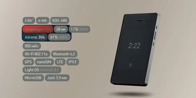 Есть две версии Light Phone II — для США и остального мира. Для американцев телефон залочен под сим-карту: ежемесячно нужно платить деньги за использование тарифа, минимальная ставка — 30 баксов (2,7К рублей) + налог. Глобалка не имеет ограничений. Теперь о спецификациях — девайс получил экран на основе электронных чернил размером 2,8 дюйма с разрешением 600 х 480 пикселей, процессор Snapdragon 210, 1 Гбайт ОЗУ и 8 Гбайт встроенной памяти, есть поддержка LTE и Wi-Fi, GPS, батарея имеет емкость 950 мАч.
