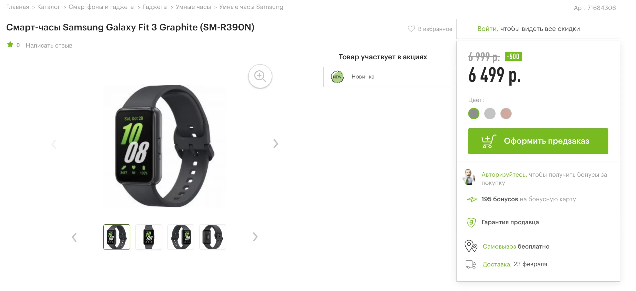 Авторы DGL обратили внимание, что страница с Samsung Galaxy Fit 3 появилась на сайте «Эльдорадо». Здесь браслет оценили в 6999 рублей, но на старте сбора предзаказов носимый гаджет будут отдавать на 500 рублей дешевле.