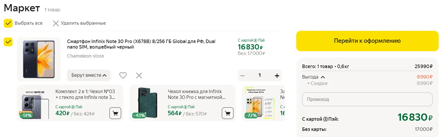 А цена очень радует: прямо сейчас Infinix Note 30 Pro доступен на Маркете всего от 16 830 рублей с учетом оплаты фирменной картой «Пэй». Если что, такой прайс актуален для столичных продавцов, а в регионах может незначительно отличаться — проверяйте ценники местных селлеров.