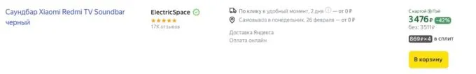 Сейчас популярнейший Xiaomi Redmi TV Soundbar можно забрать на Яндекс Маркете всего за 3511 рублей. Также не забывайте, что некоторые банки готовы отсыпать щедрый кэшбек за покупку на этой платформе.