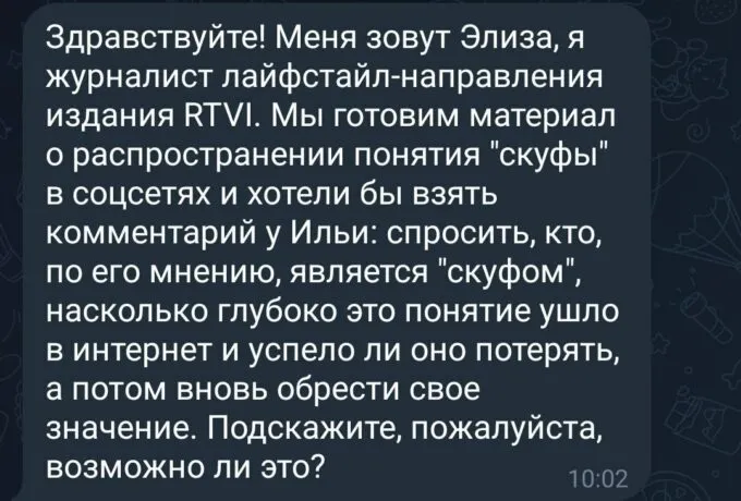 29 февраля Мэддисон опубликовал в телеграм-канале скриншот с сообщением от журналистки издания RTVi. Короля рунета попросили ответить на парочку вопросов: объяснить, кто, по его мнению, является скуфом и насколько глубоко это понятие ушло в интернет.