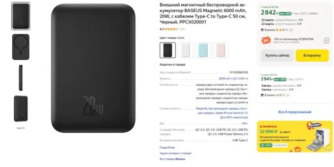 Сейчас на Яндекс Маркете отличный пауэрбанк Baseus Magnetic Mini Wireless можно купить за 2727 рублей по промокоду 0CB9VPNK. А с кэшбеком некоторых банков он обойдется в ~2 косаря.