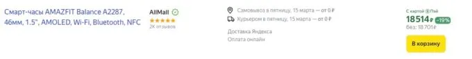 Обычно за Amazfit Balance просят больше 20 тысяч рублей, но прямо сейчас на Яндекс Маркете их можно приобрести со скидкой за 18 700 рублей. А с кэшбеками некоторых банков они обойдутся ещё дешевле.