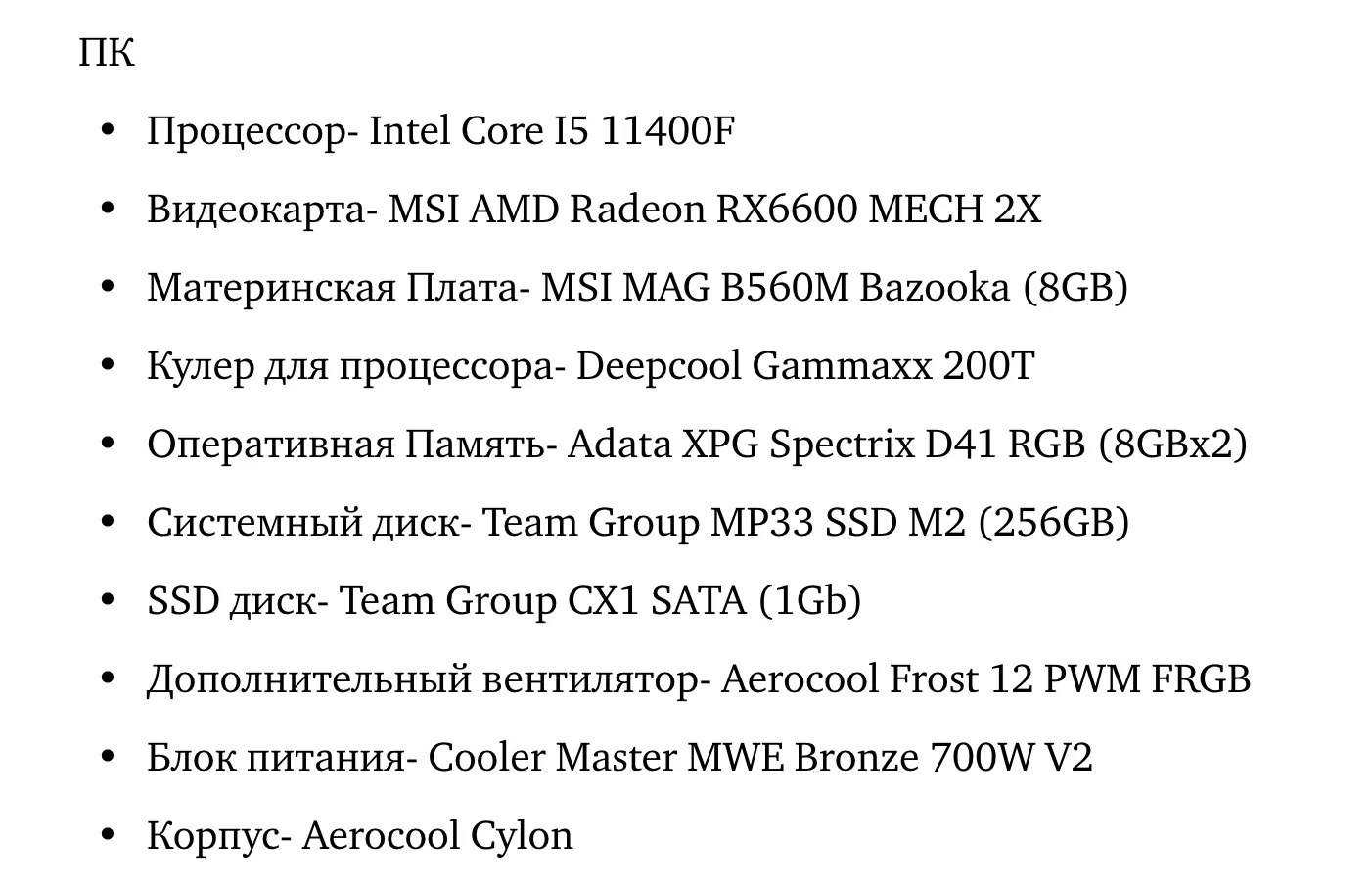 Автор остановился на связке Intel — AMD. Был выбран процессор Intel Core I5 11400F, видеокарта MSI AMD Radeon RX6600 MECH 2X, материнская плата MSI MAG B560M Bazooka (8GB), 16 Гбайт ОЗУ и прочие аксессуары (на скрине ниже).