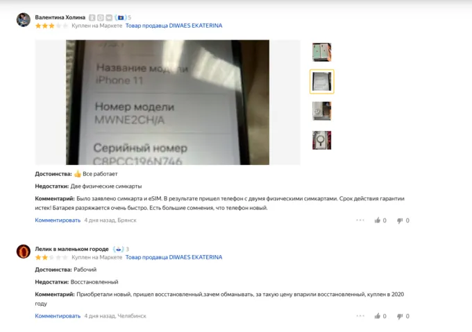 Одного из покупателей с самого начала смутило, что ему привезли iPhone с двумя физическими SIM-картами, хотя он заказывал версию с поддержкой e-SIM, плюс у этого экземпляра, по его словам, быстро разряжается батарея и истёк срок гарантии производителя, о чём сообщается в настройках. Другой покупатель прямо обвинил селлера в том, что он прислал восстановленный смартфон, который первому владельцу продали ещё в 2020 году. Третьему рецензенту повезло ещё меньше — его смартфон просто не видит SIM-карту.
