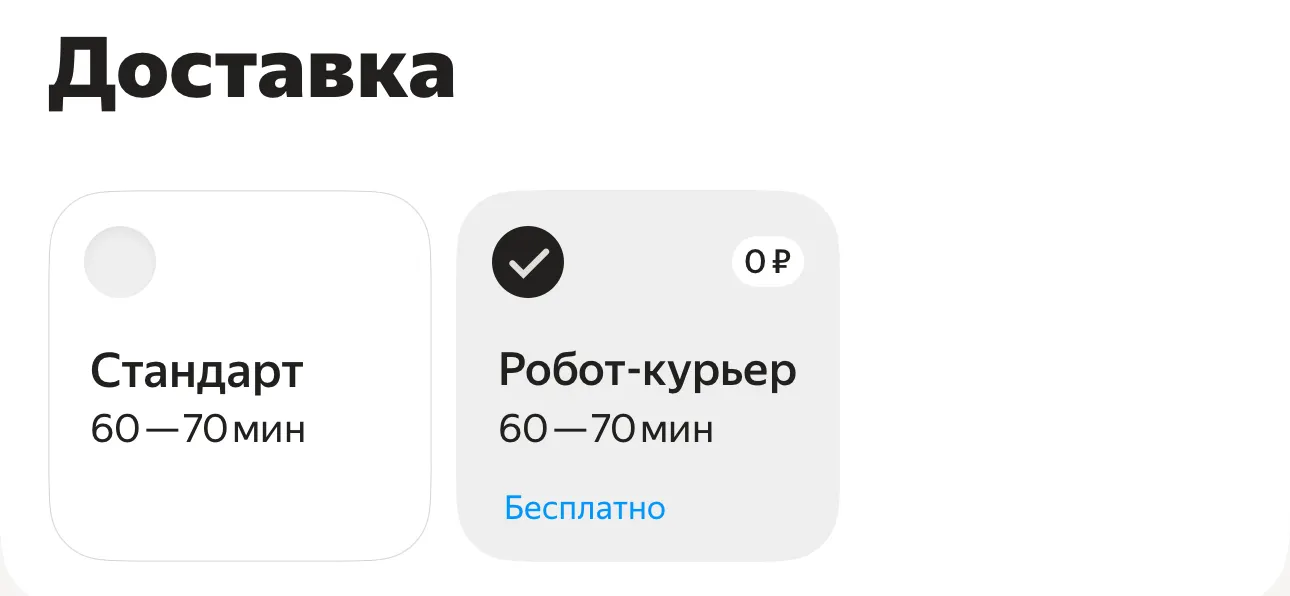 В приложении «Еды» выбирайте не курьера, а робота. Интересно, что стоимость доставки в таком случае не спишется. Время доставки примерно такое же, что и с помощью живого курьера.