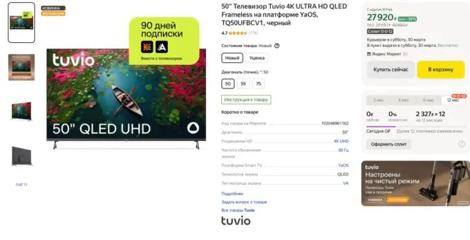Суббренд Яндекса Tuvio, который специализируется на электронике и бытовой технике, продолжает захватывать рынок смарт-телевизоров. И если изначально всё внимание было сосредоточено на довольно бюджетных моделях, то сейчас компания покоряет средний и премиальный сегменты. Например, сейчас 50-дюймовый ТВ с QLED-дисплеем и тонной умных функций можно забрать за ~25 тысяч рублей. Как вам такое?