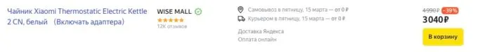 Сейчас топовый чайник Xiaomi Thermostatic Electric Kettle 2 можно купить на Яндекс Маркете всего за 3040 рублей. А с кэшбеками некоторых банков он обойдётся в 2,5 косаря.