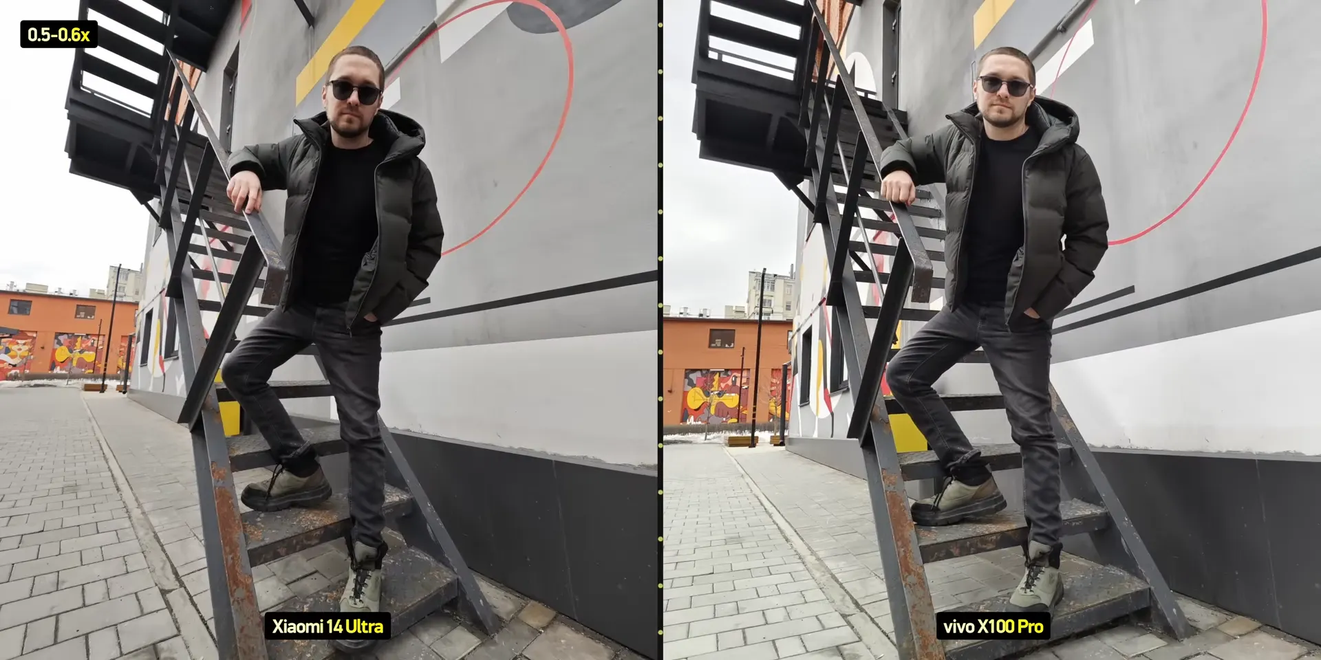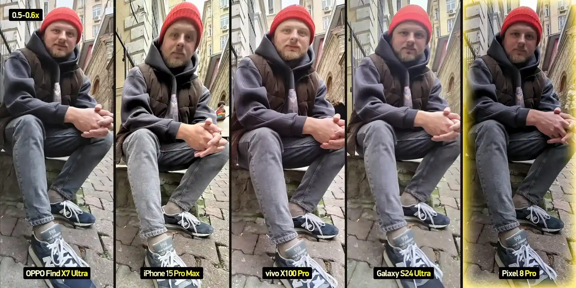 Начали с ультраширокоугольной камеры. Сразу видно, как ужасно сжал человека iPhone 15 Pro, но и другие аппараты справились не на отлично. Все-таки, лучше людей на такую камеру не снимать.