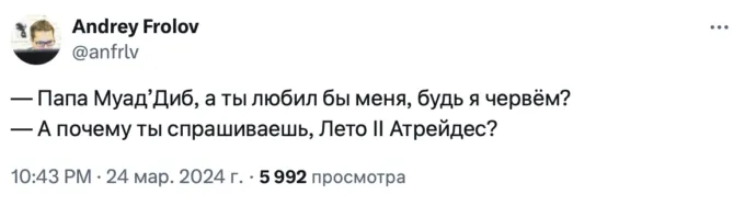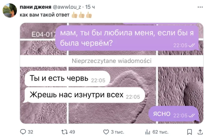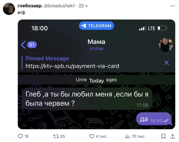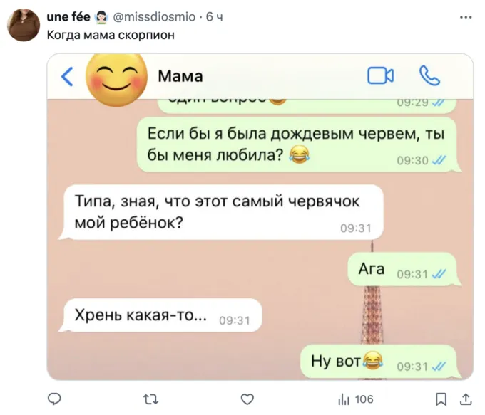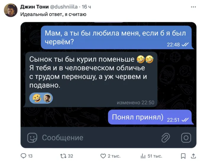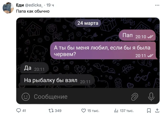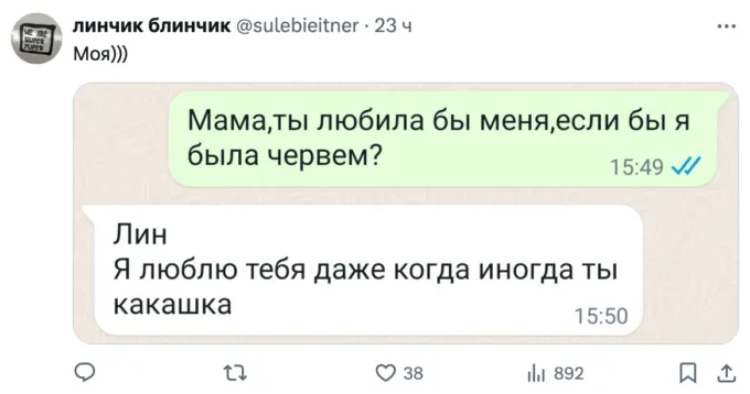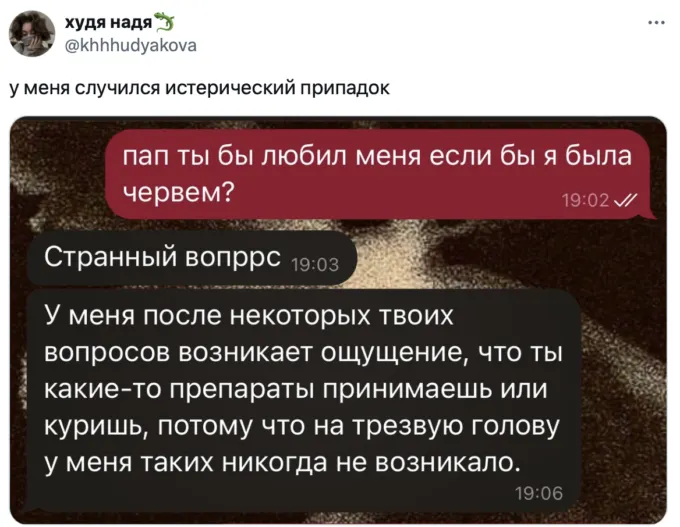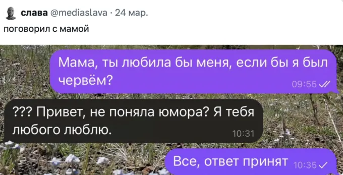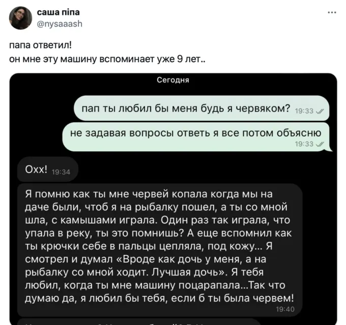 Пользователи твиттера начали задавать своим родителям и близким необычный вопрос. Он звучит примерно так: «Любил бы ты меня, если бы я был червем?»
