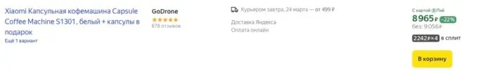 Саму кофемашину Xiaomi Mijia Capsule Coffee Machine S1301 можно урвать на Яндекс Маркете всего за 9056 рублей и кэшбекнуть до 30% при оплате картами некоторых банков.