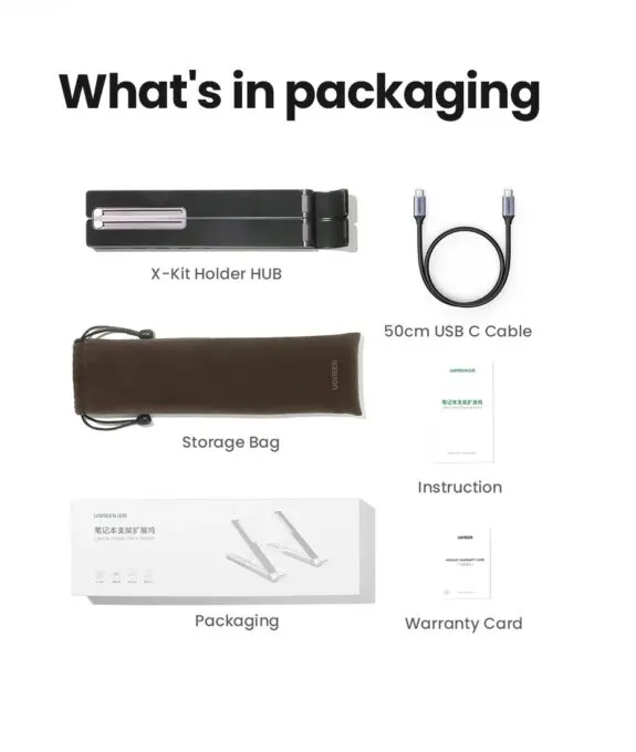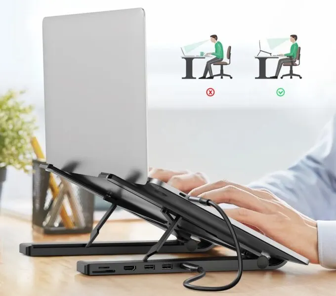Ugreen X-Kit Holder Hub представляет собой складную подставку с регулировкой по высоте и встроенным концентратором на 5 портов. Именно такой тип подставки максимально полезен для здоровья при повседневном использовании ноута. Она позволяет расположить экран на уровне глаз, что избавит вас от сутулости и снизит нагрузку на шею. Вы сможете сидеть за компом с прямой спиной.
