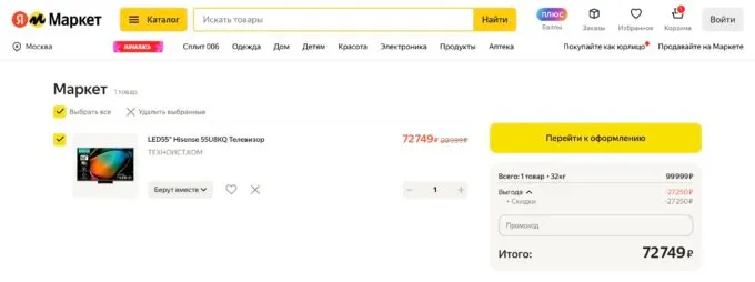 Хотите забрать крутой телик с максимальной выгодой? На момент составления заметки Hisense 55U8KQ можно приобрести на Яндекс.Маркете всего от 72 749 рублей. Стоит отметить, что цены могут варьироваться в зависимости от региона — нужно переключиться на столицу и проверить можно ли оформить доставку.
