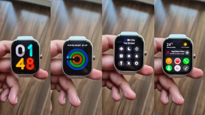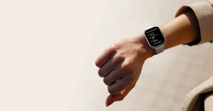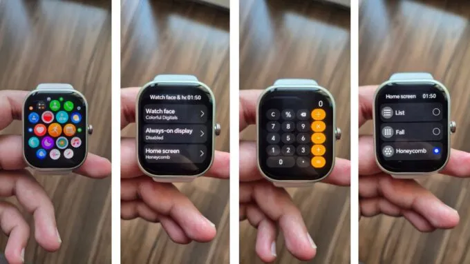 Девайс имеет довольно крупный 1,95-дюймовый AMOLED-дисплей с разрешением 502 x 410 пикселей, частотой обновления 60 Гц и пиковой яркостью в 550 нит. Сверху панель прикрыта слегка изогнутым 2,5D стеклом. Так часы выглядят более безрамочными, особенно если установить тёмный циферблат. Тут даже отключить дисплей можно, накрыв его ладонью, прямо как у Apple.