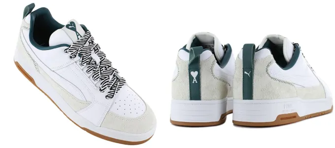 Второй айтем – белые Puma X AMI Paris Slipstream Lo 2. Это коллаборация обувной компании с модным французским брендом AMI. Верх выполнен из натуральной кожи и украшен массивными шнурками, а на заднике расположились логотипы Puma и AMI. Кроссовки выглядят как идеальный вариант на весну.