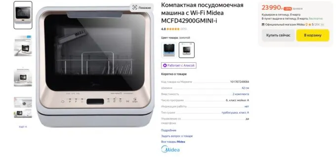 Если вы цените своё время, то обязательно присмотритесь к этому устройству. Как раз сейчас на Яндекс Маркете смарт-посудомойку Midea MCFD42900GMINI-i можно забрать за 23 990 рублей. Также не забывайте, что многие банки предлагают кэшбек до 15% с покупок на этой платформе.