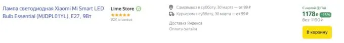 Сейчас на Яндекс Маркете умную лампу Xiaomi Mi LED Smart Bulb Essential можно купить за 1190 рублей, а с кэшбеками некоторых банков она обойдётся дешевле косаря.