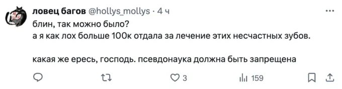 Как ученые из запрещенной соцсети борются с запахом изо рта, который обязательно возникает, если не чистить зубы? Никак. По словам мужа-психолога, запах появляется на уровне мозга в виде защитной реакции — якобы тем самым человек хочет кого-то отпугнуть. Алексей уверен, что в случае появления запаха нужно идти не к стоматологу, а пройти терапию.