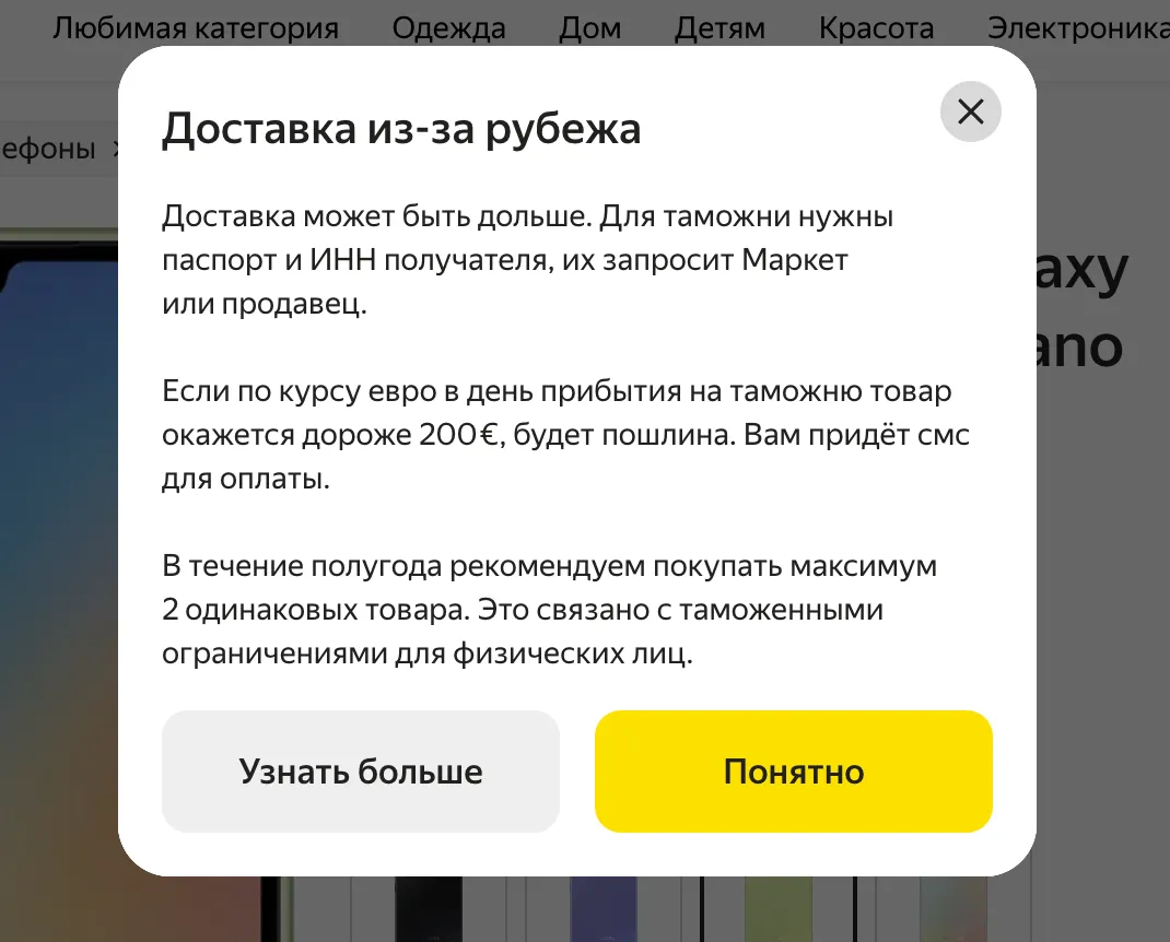 Интересно, что о новых требованиях должны объявить только 1 апреля, но интернет-магазины уже подготовились. Например, Маркет уже рассчитывает пошлину, исходя из новых правил. Пример доставляемого из-за рубежа товара.
