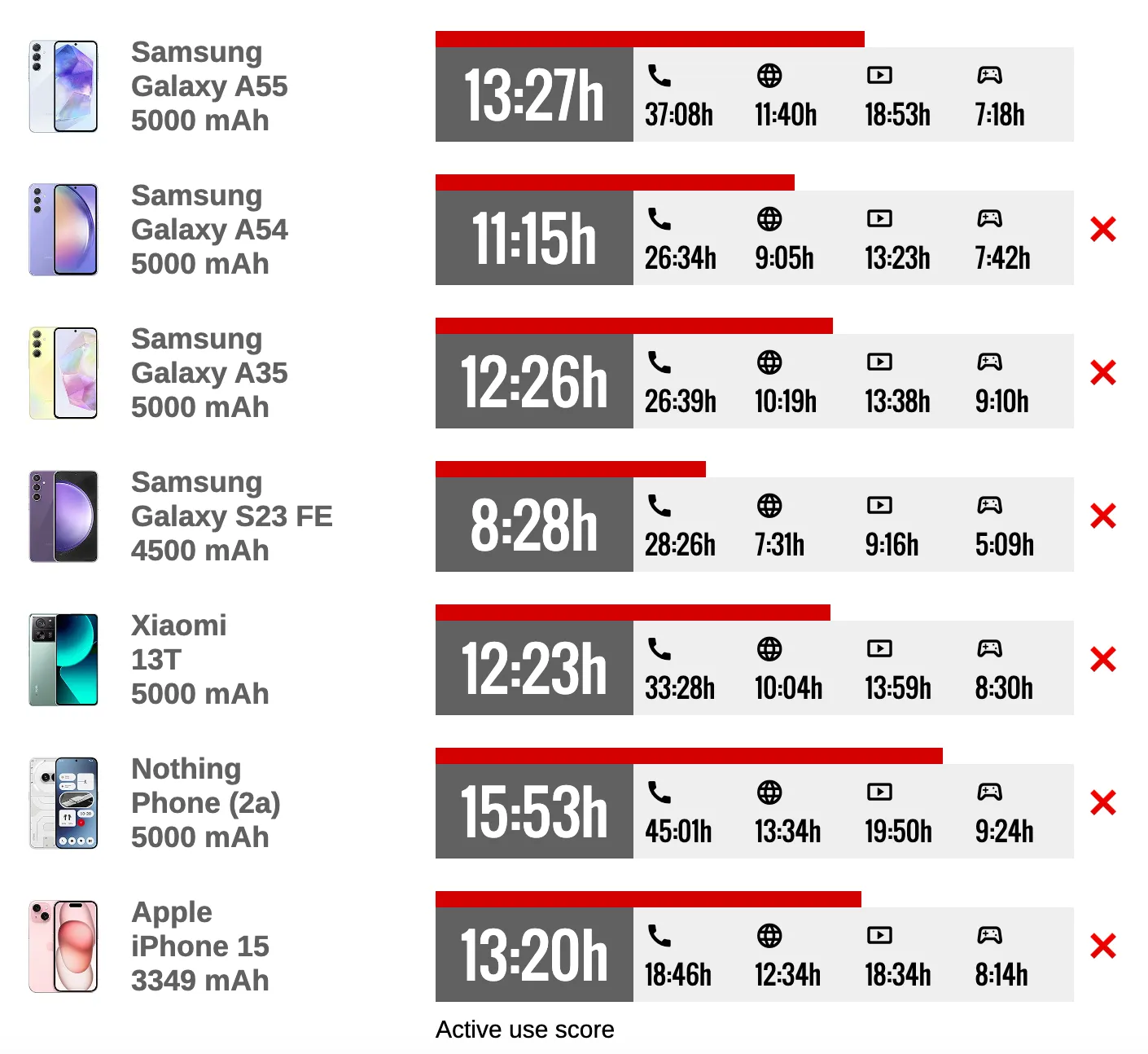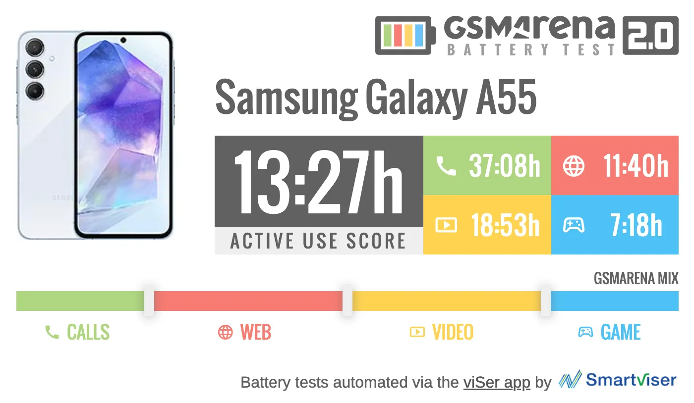 Девайс получил значительное улучшение времени автономной работы по сравнению с Galaxy A54. Прогресс виден везде, кроме гейминга. При активном использовании смартфон может протянуть 13 часов 27 минут.