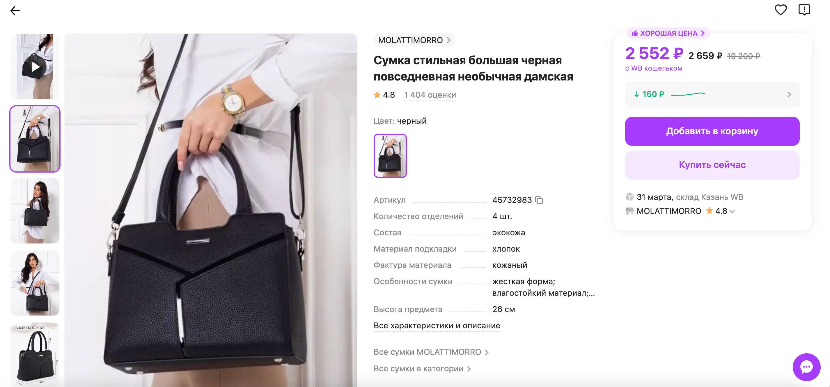 Во-вторых, нужно включить сюда логистику — стоимость хранения, транспортировки, доставки. В-третьих, вы же не забудете оплатить пошлину? Получается, что быстрее и проще заказать сумку на WB или Ozon.