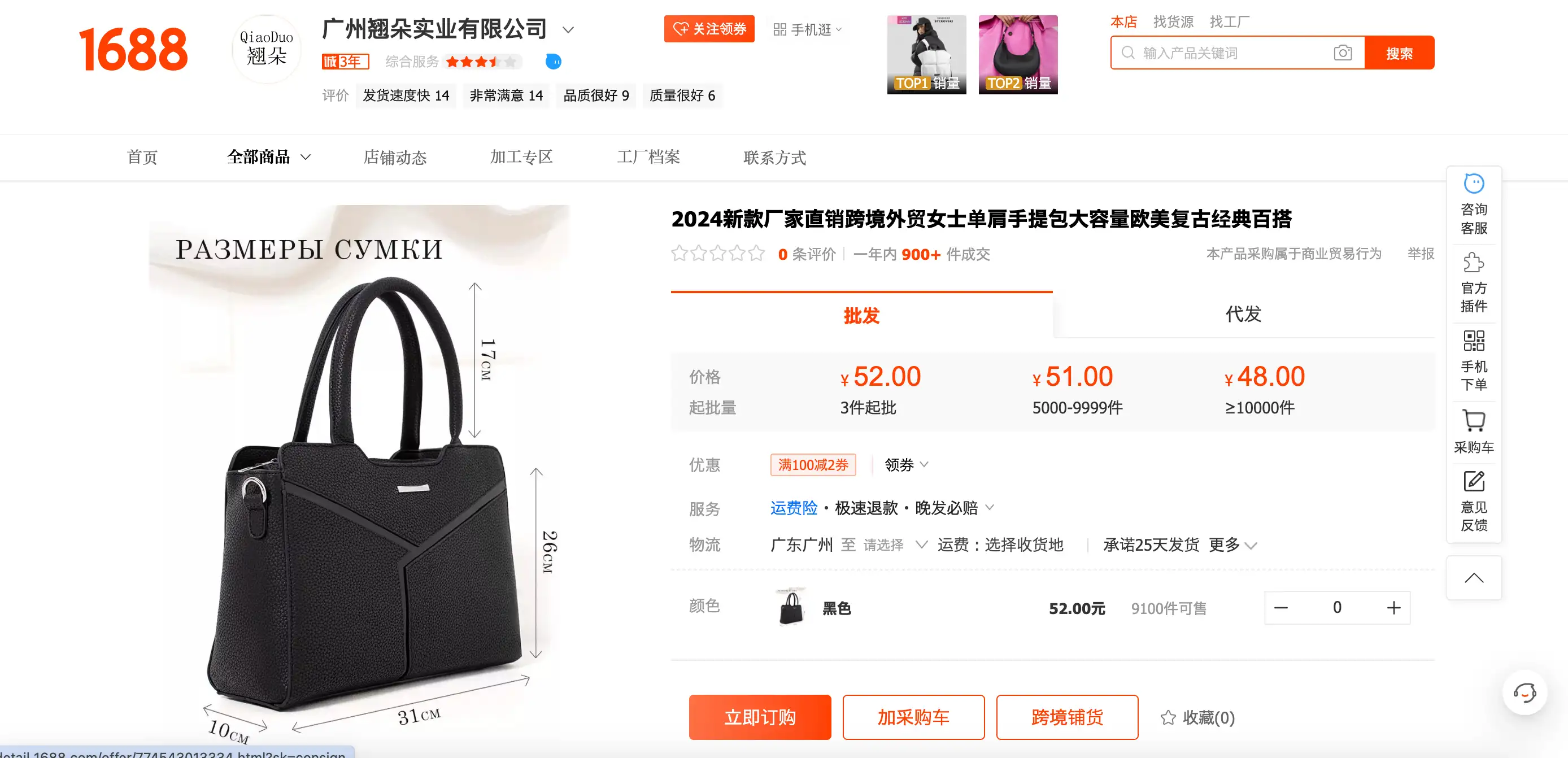 Если разберетесь с сайтом, который работает на китайском, можно заказывать вещи дешевле. Но есть несколько нюансов. Во-первых, часто вещи можно покупать партией минимум 2-3 штуки — например, как в случае этой сумки. При заказе от 10 тысяч штук продавец даже готов толкнуть ее не за 52, а за 48 юаней.