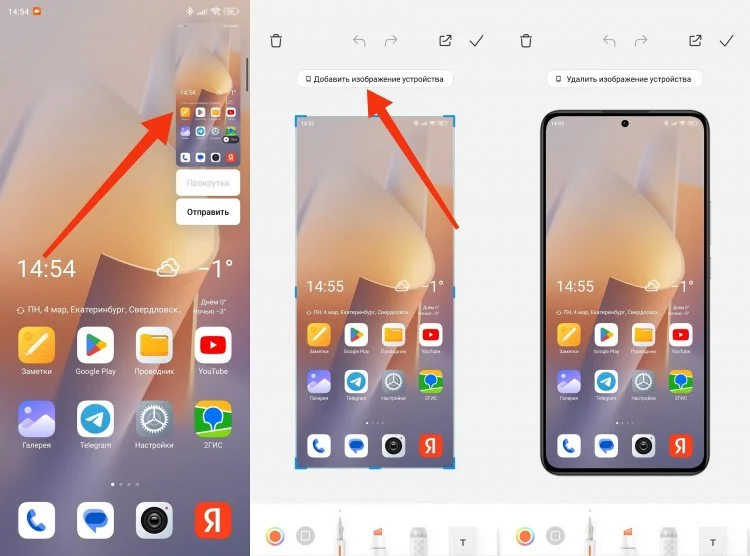 Следующая опция пригодится не всем, но приятно, что она есть. На телефонах давно можно делать скриншот, но в HyperOS также реально автоматически помещать скриншот в рамку смартфона. Вот так это выглядит — делаем скриншот, нажимаем на миниатюру, выбираем «Добавить изображение устройства» и получаем стильный снимок экрана.